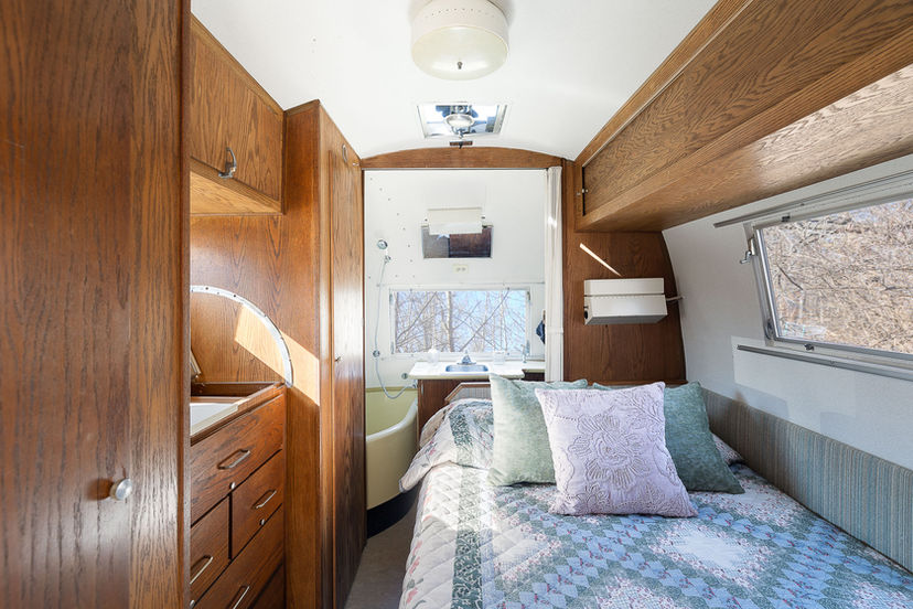 This was another one of our period-correct restorations. We kept as many original materials as we could. The cusion inserts on both beds and the couch were replaced, while we kept the upholstery fabric intact. The original wallpaper was peeling, so we had a replica made to match. In addition to new flooring, we also restored the tambour, re-chromed all appliances, and added a new retro-style bluetooth radio.