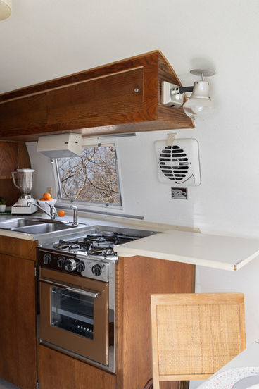 We restored this trailer to be as close to the original design as possible, while adding modern touches. We started by updating the flooring with a luxury woven vinyl, a durable option equipped with UV-fade resistance and antimicrobial technology. We later addressed all the tambour cabinets that were broken or off-track and refinished them. Finally, we had all the oven hardware re-chromed, and the upholstery and curtains were updated with new fabric.
